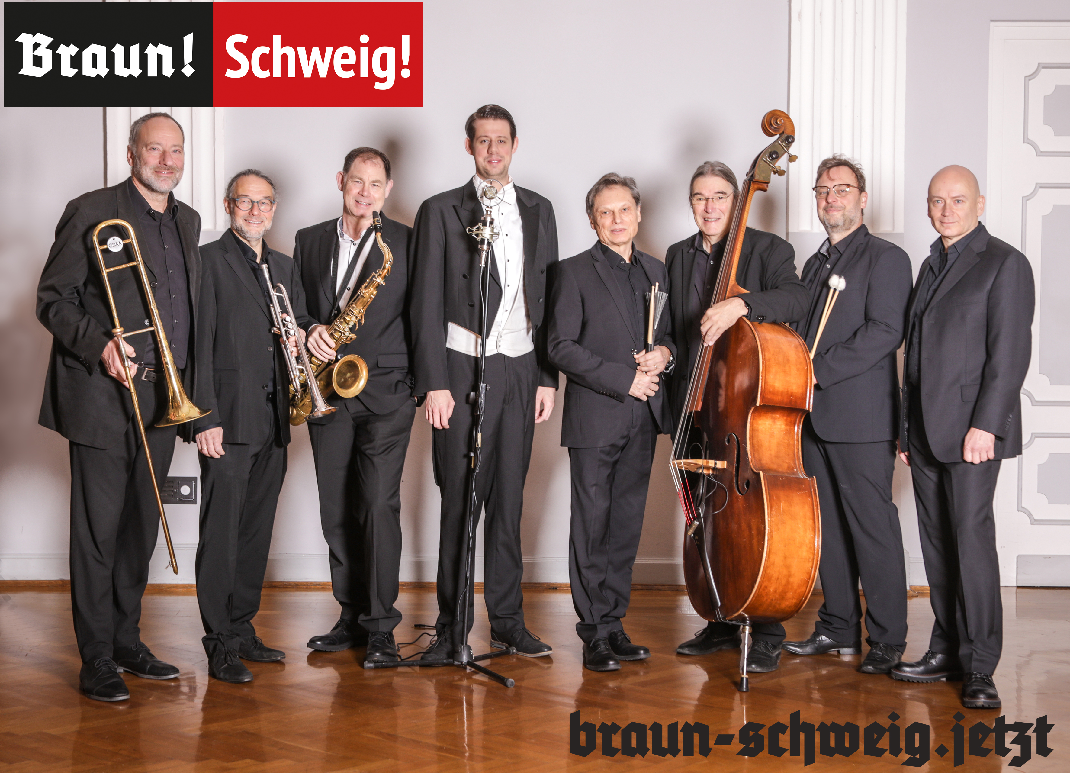 Es folgt der erste öffentliche Auftritt des Jazz-Swing-Orchesters BRAUN!SCHWEIG! mit ihrem Leadsänger und Conférencier Jake Muffet aus Großbritannien. Im Programm auch Musiknummern aus der Zeit nationalsozialistischer Propaganda mit den Fake-New-Texten, mit denen die Nationalsozialisten über Ihren Auslandsender GERMANY CALLING versucht haben, den Feind zu demoralisieren.